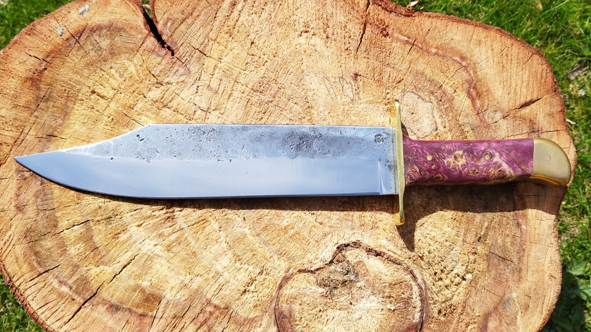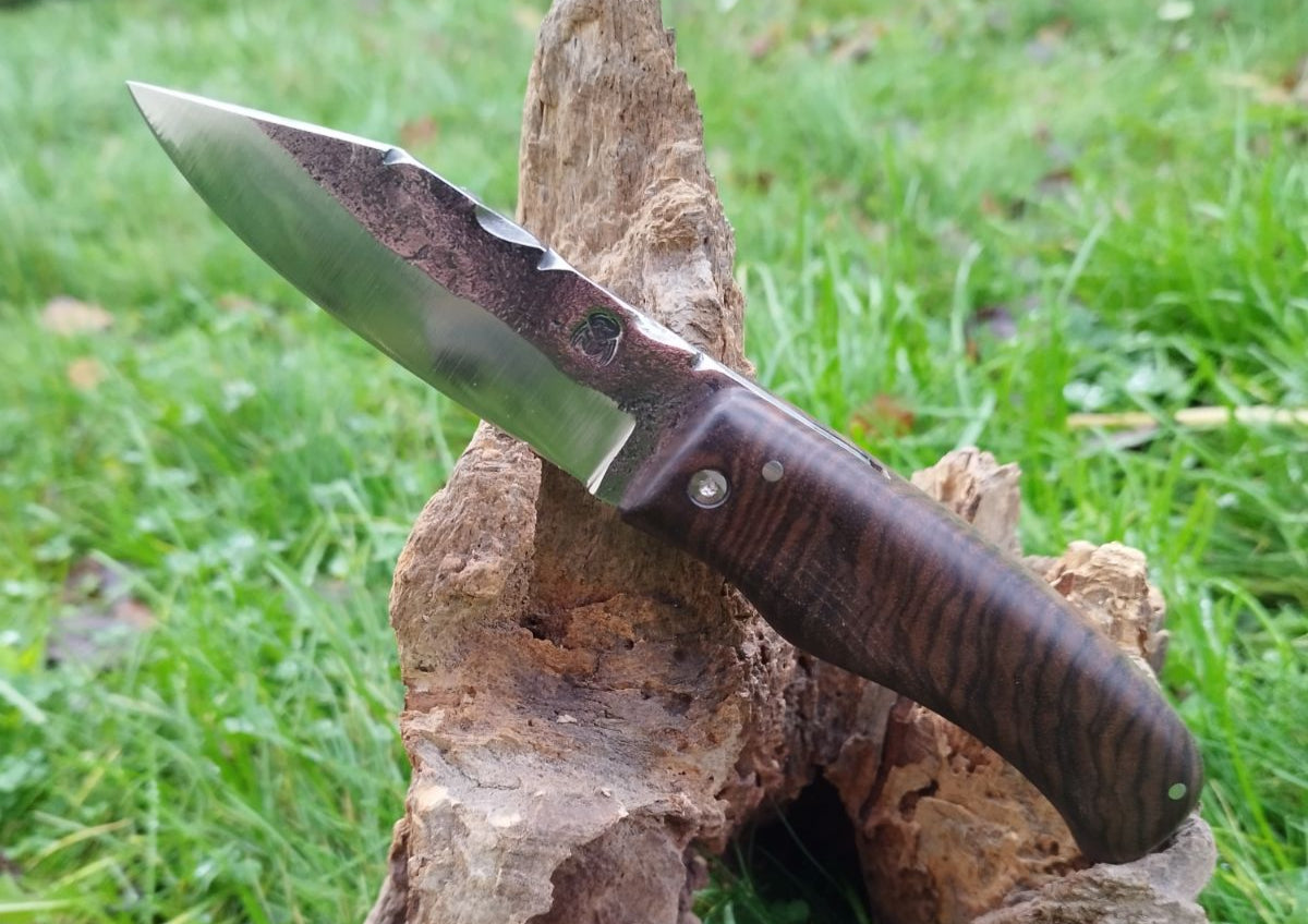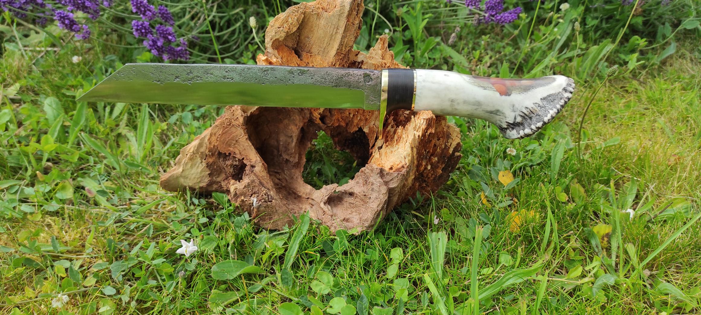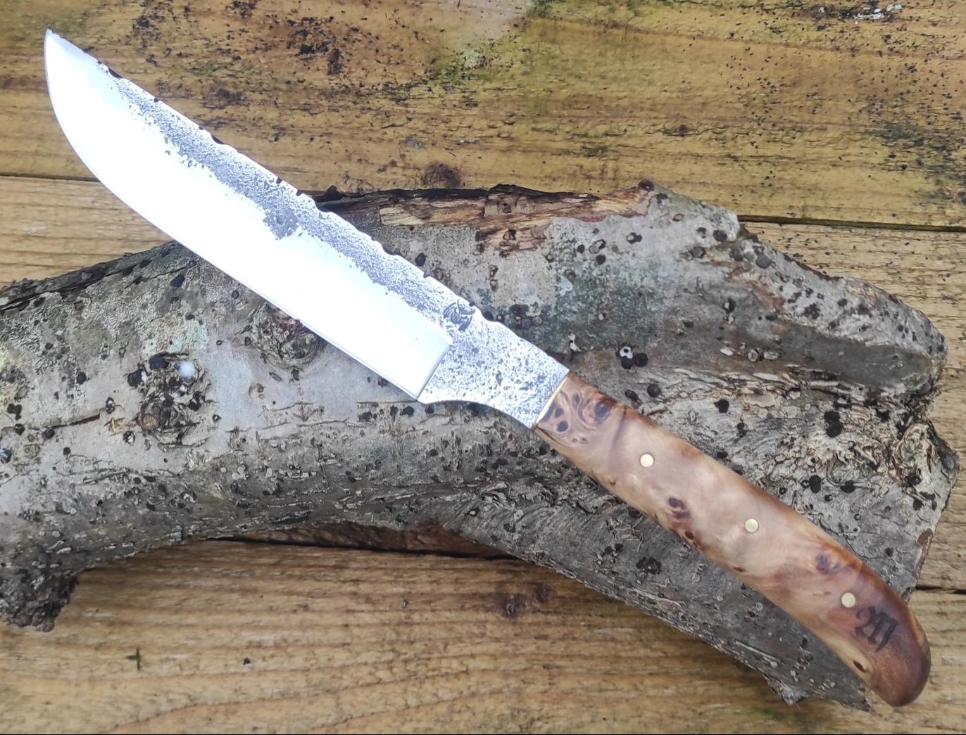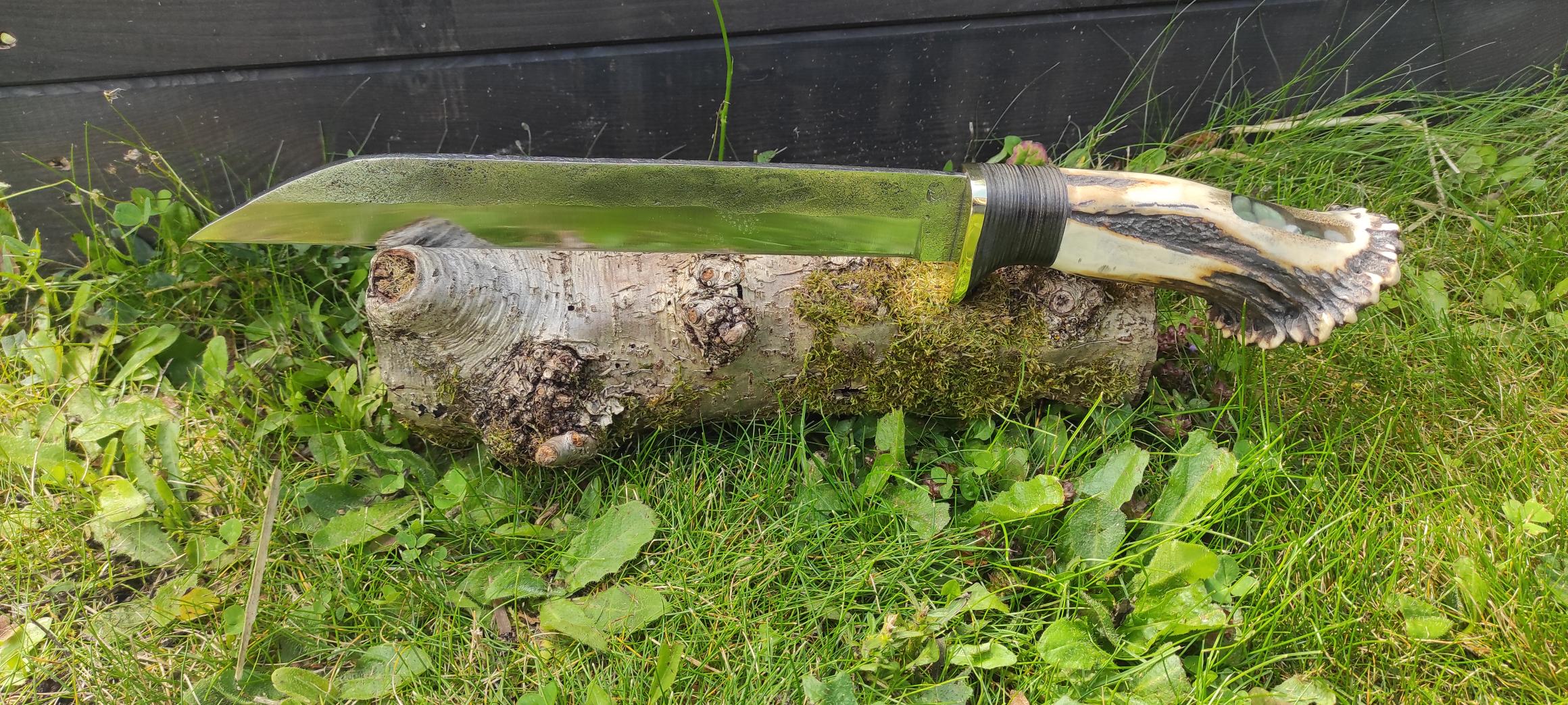Fabriquer en lame de ressort de camion avec une garde en bronze et un manche en bois de chevreuil.