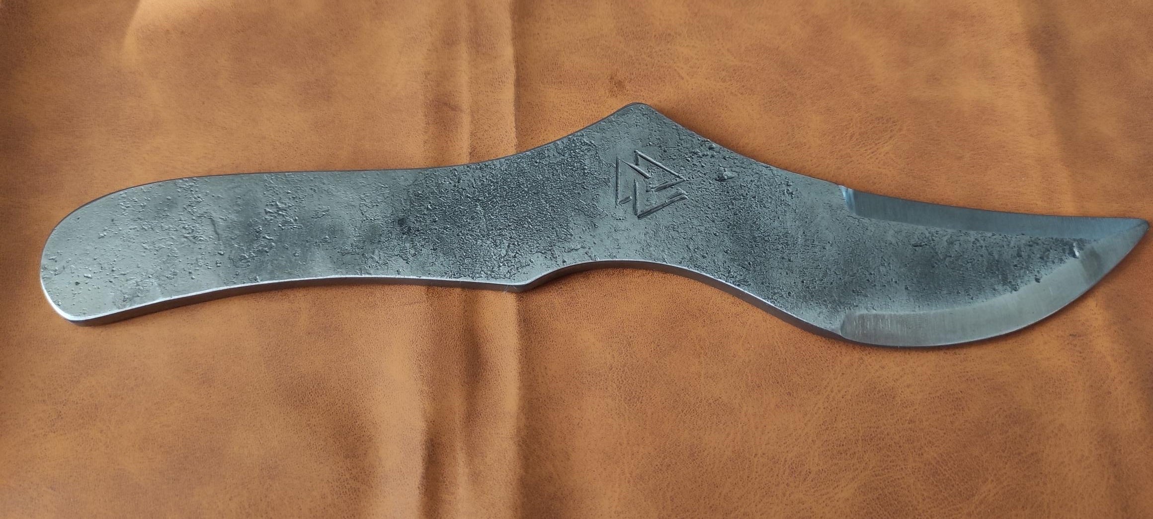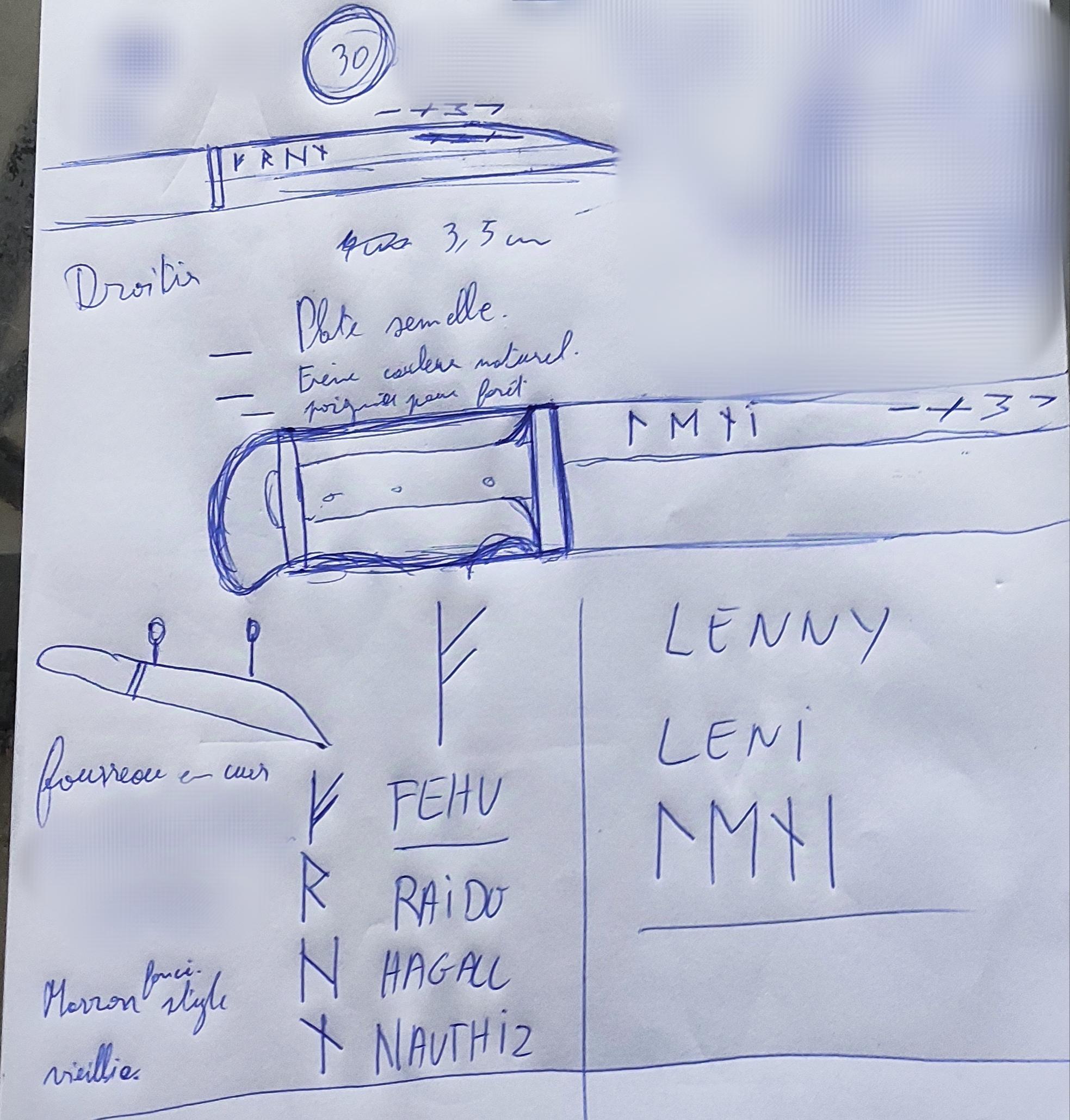 Gravure sur le manche : le VALKNUT (le nœud des occis en vieux norrois, valr : guerrier et knut : nœud) ce qui représente le client car il a ce tatouage.
