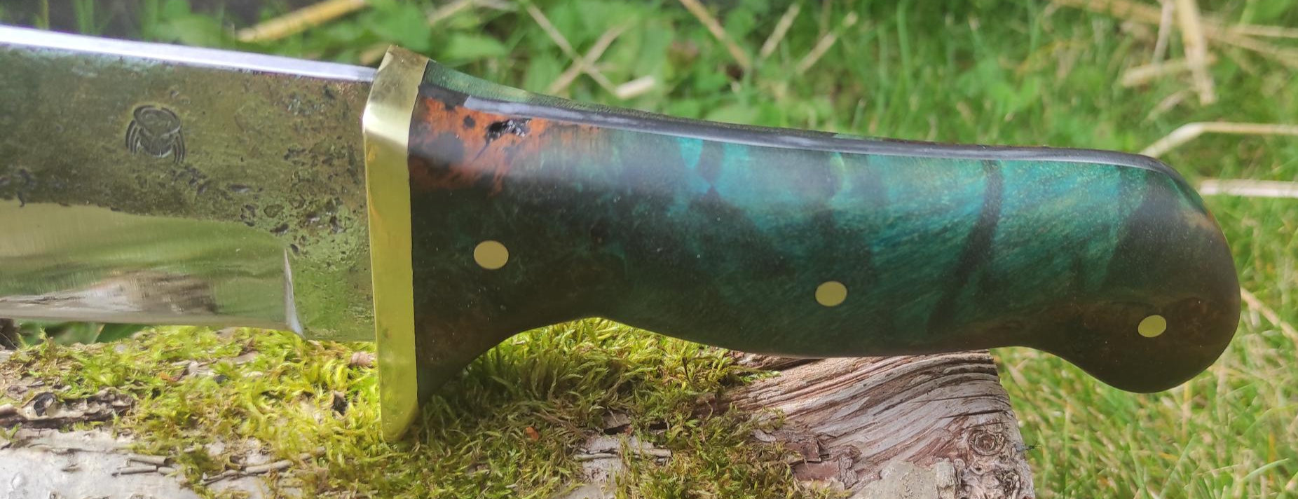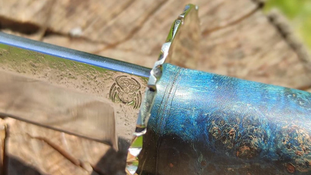 Garde : ronde en bronze et un manche en loupe d’érable stabilisée bleue.